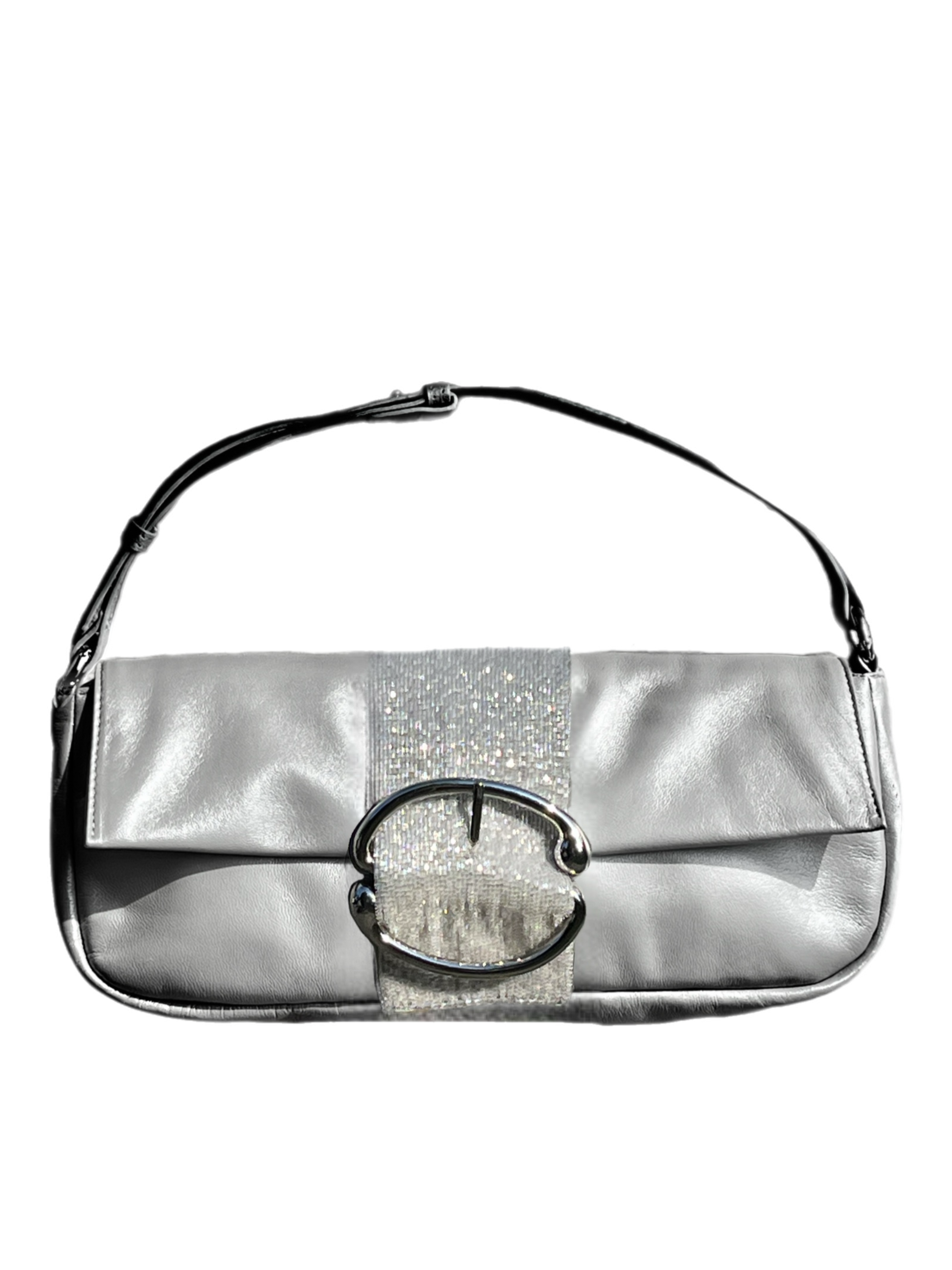 Our Beaded Platinum Baguette features shimmering iridescent beads that captures the light beautifully. Crafted from buttery soft pearlized leather with a plush suede interior and a removable strap that lets you switch effortlessly from day to night.