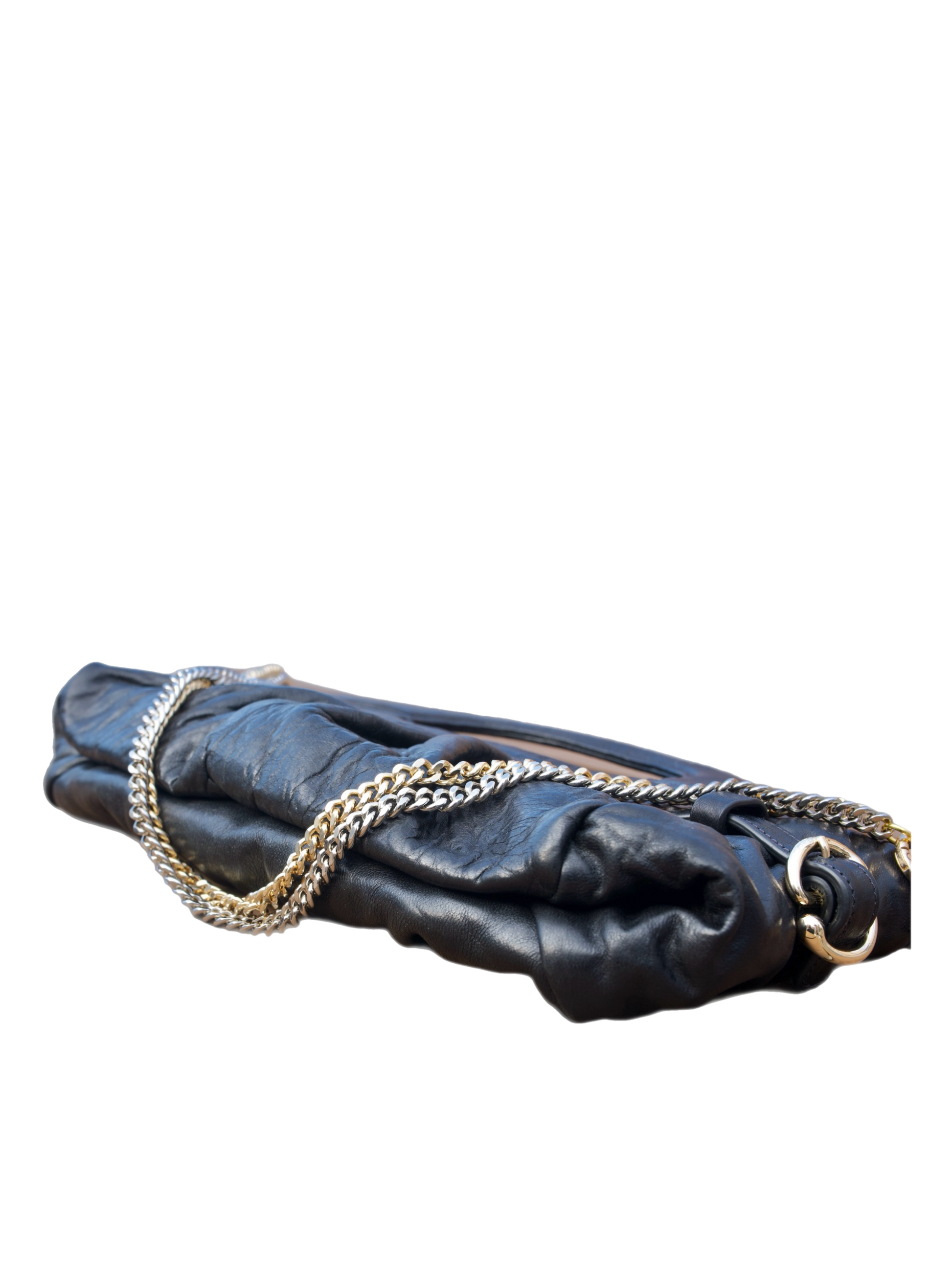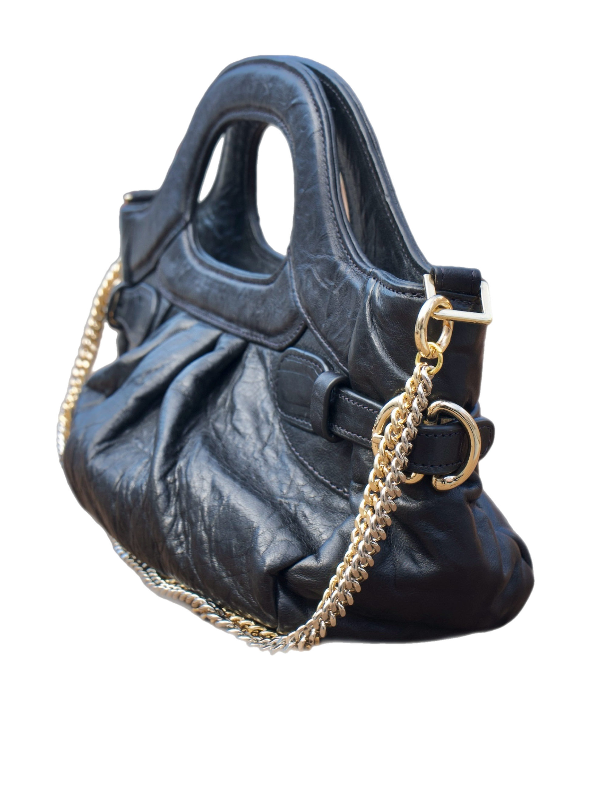 Distressed black leather accented with pleated detailing and a dual toned chain gives the Larissa its blend of modern sleek and mid century glamour.