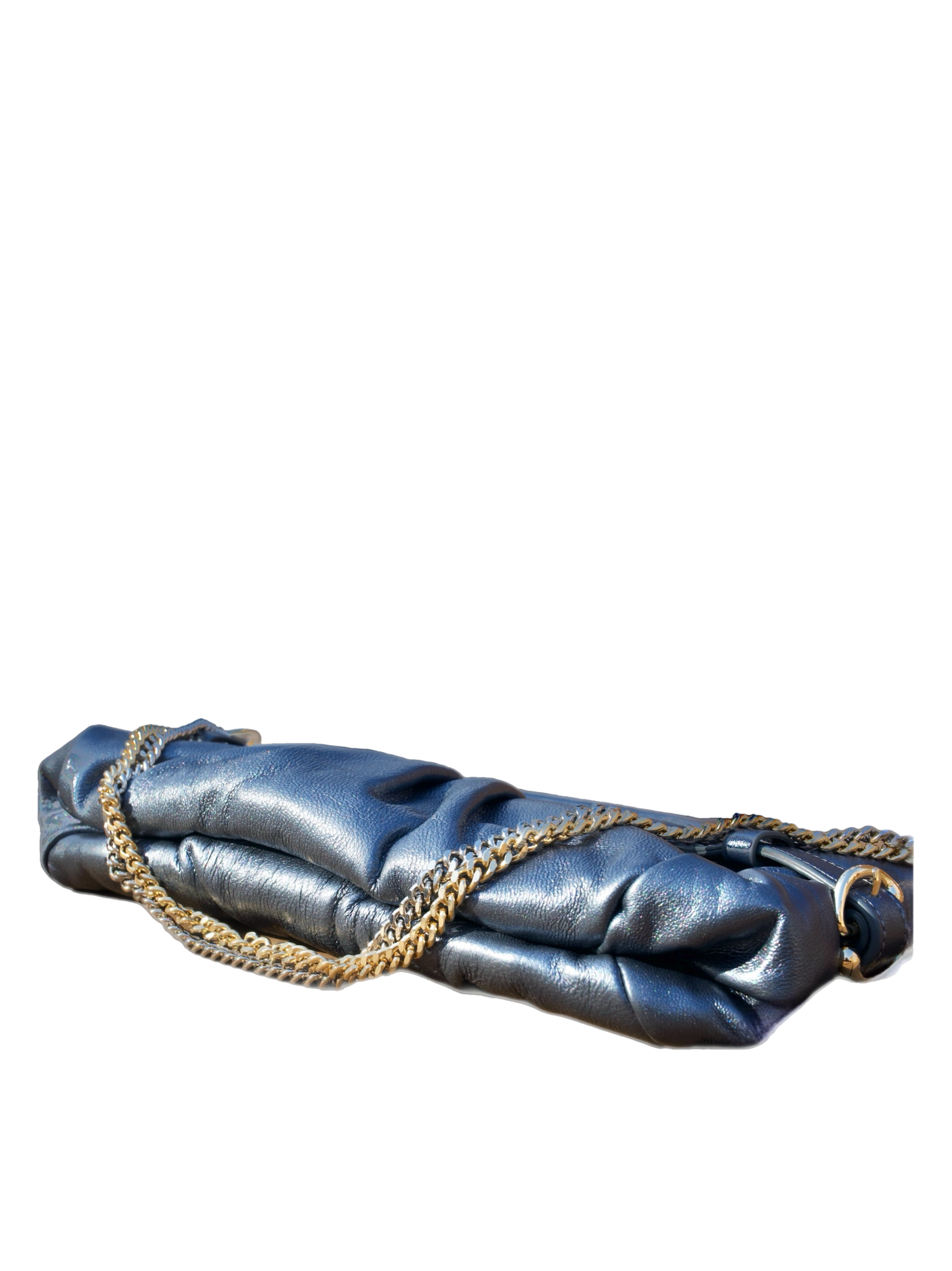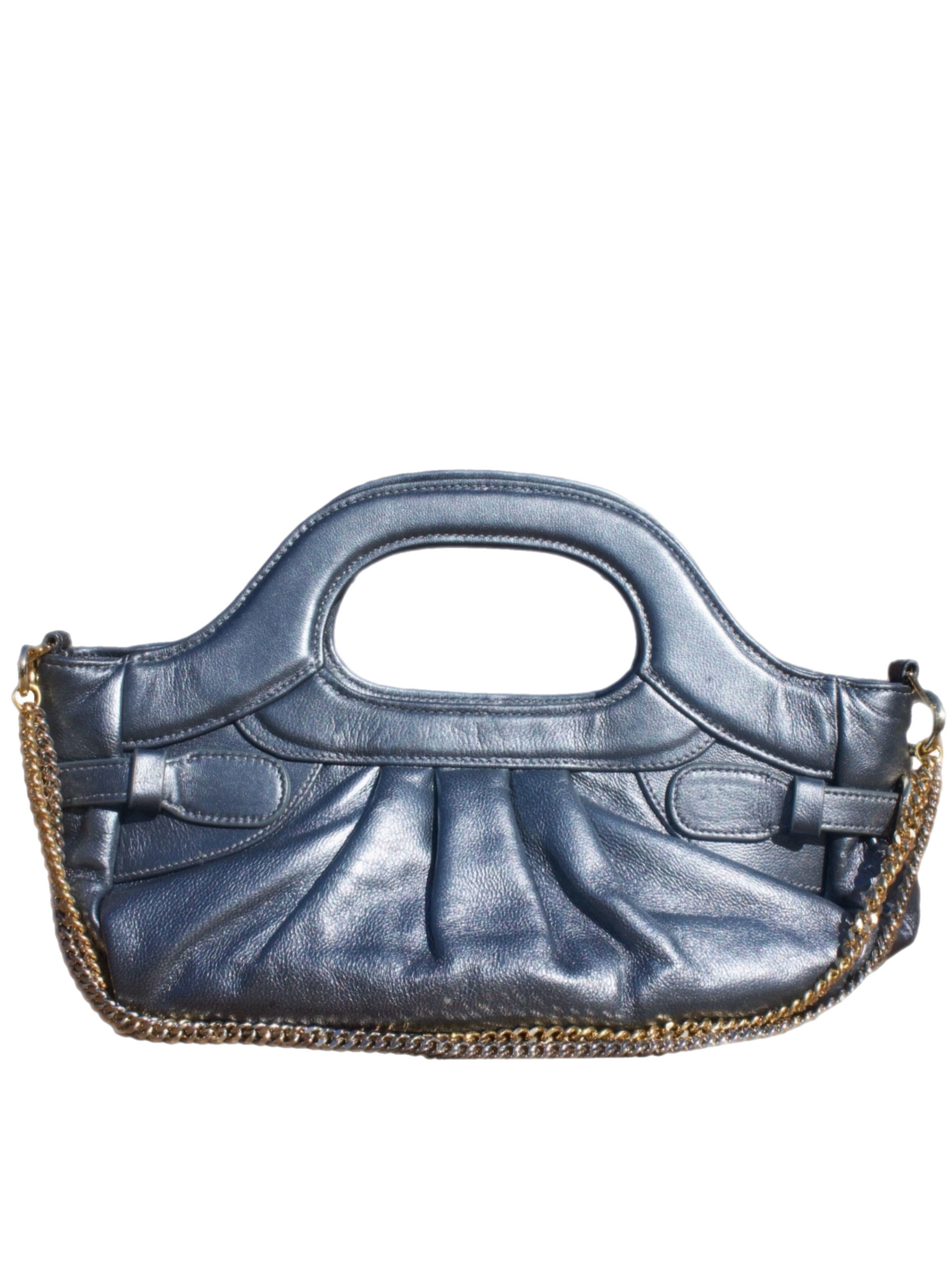 Pearlized gunmetal leather accented with pleated detailing and a dual toned chain gives the Larissa its blend of modern sleek and mid century glamour.