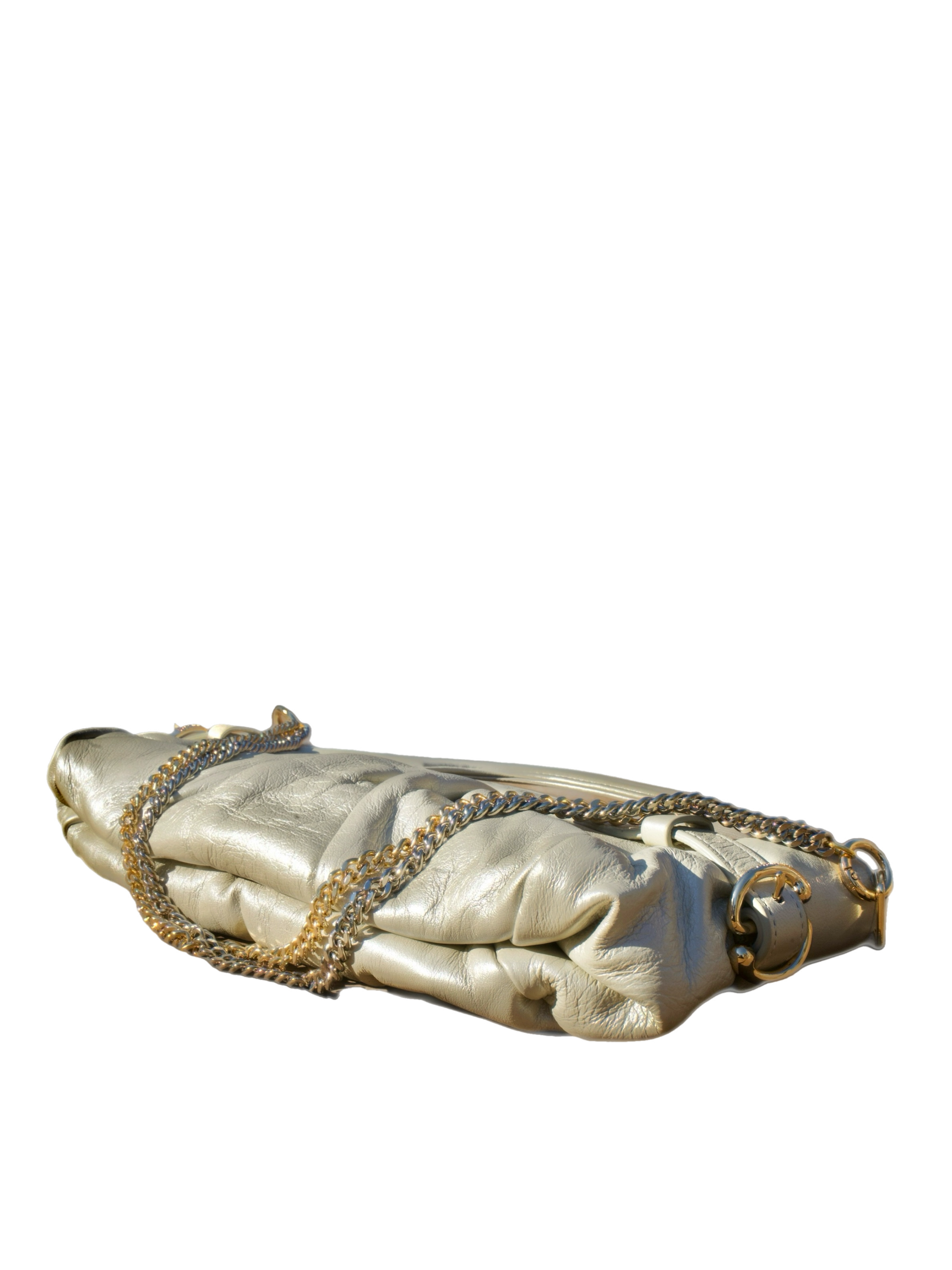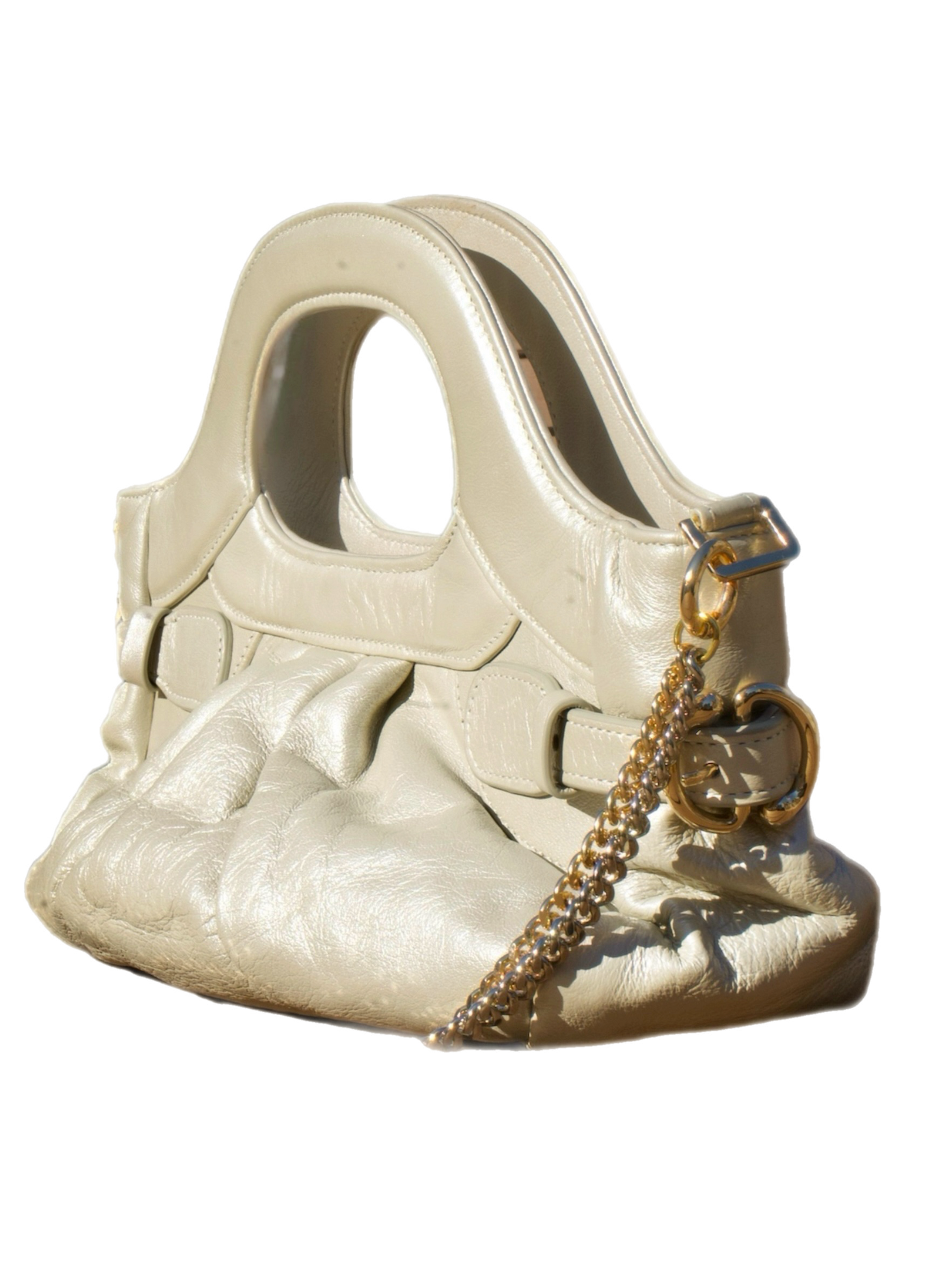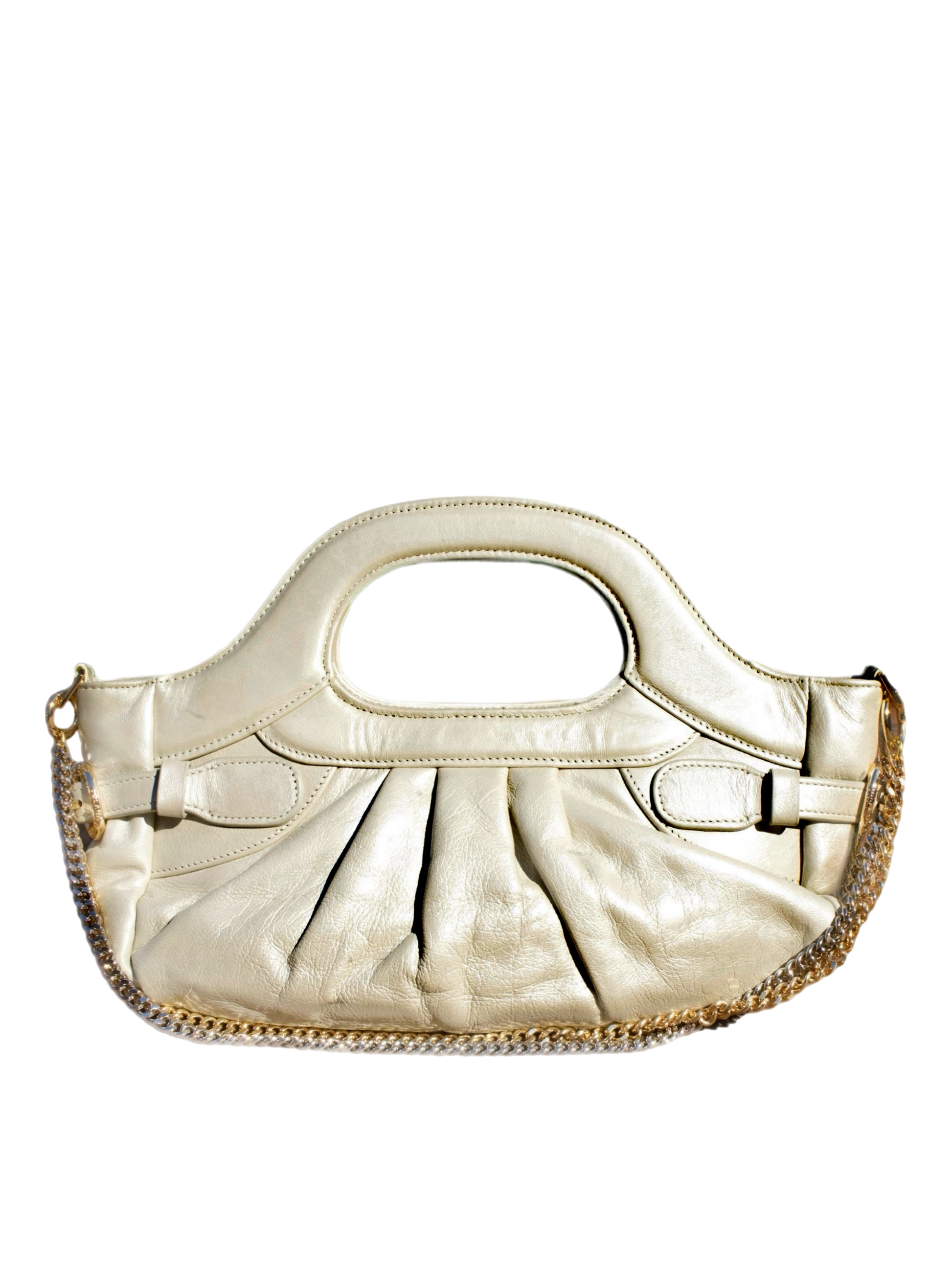 Pearlized cream leather accented with pleated detailing and a dual toned chain gives the Larissa its blend of modern sleek and mid century glamour.